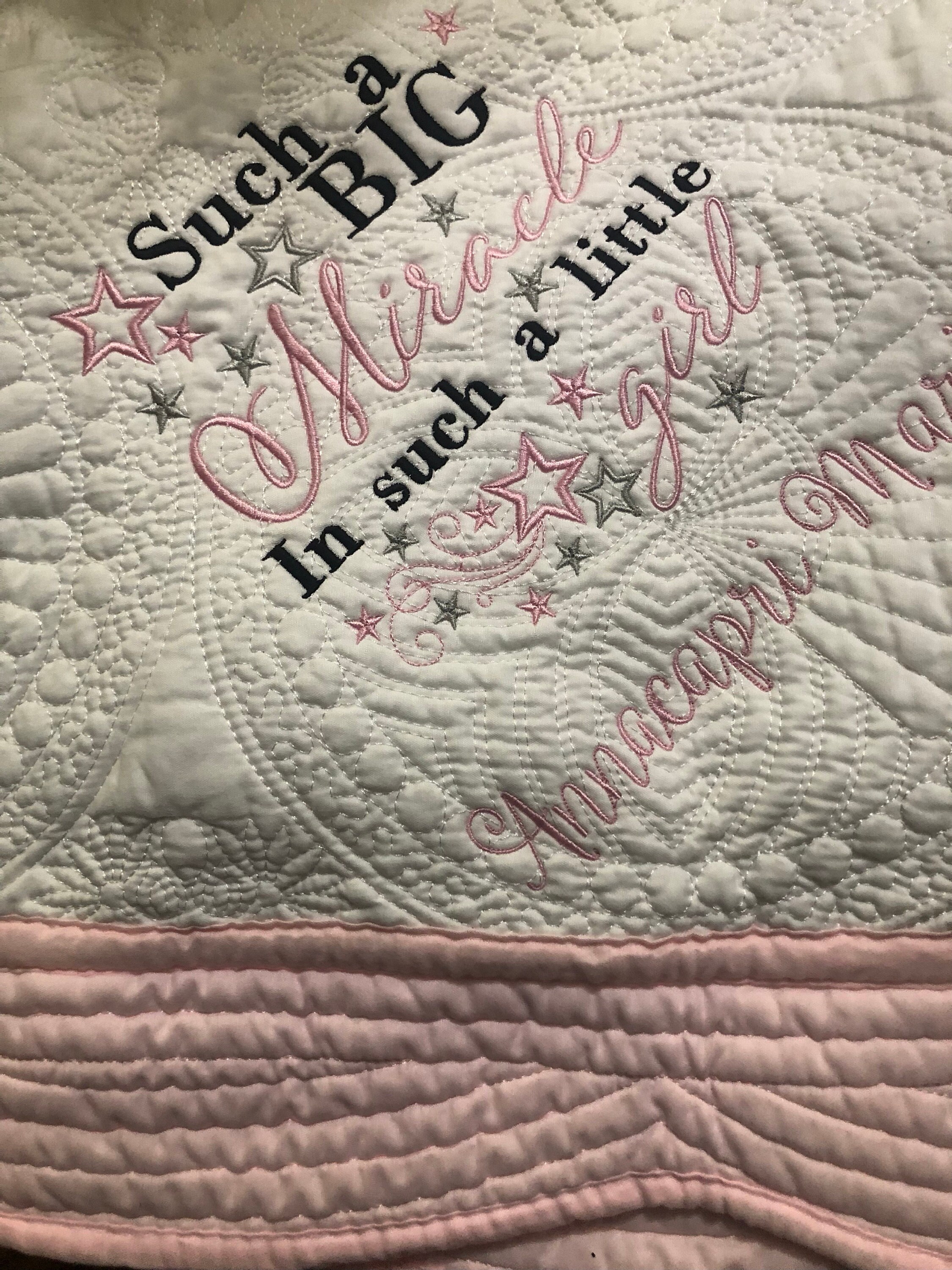 She was a joy to buy from. I added the baby name at the last minute and she was able to accommodate the request. Answered right away when I contacted her. This is a beautiful quilt I'm glad to have it.